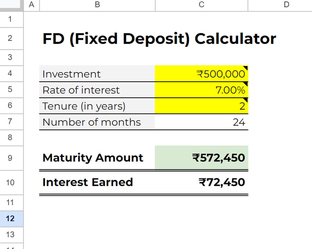 This free fixed deposit excel calculator is a Google Sheets document that works online and on the go. So you don’t need to have your computer or ever need Microsoft Excel on your device.